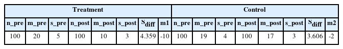 n, sample size; m, mean; s, standard deviation; Sdiff, standard deviation of mean difference; m1, mean difference between pre- and post-treatment in the treatment group; m2, mean difference between pre- and post-treatment in the control group.