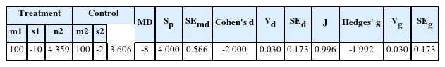 n, sample size; m, mean; s, standard deviation; MD, mean difference between treatment and control; Sp, standard deviation of MD (pooling standard deviation); SEmd, standard error of MD; Vd, variance of Cohen’s d; SEd, standard error of Cohen’s d; J, correction factor; Vg, variance of Hedges’ g; SEg, standard error of Hedges’ g.