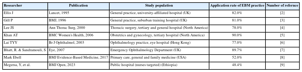 Conversely, lower rates have been observed in other settings. Ebell (2017) reported that the EBM application rate in U.S. primary care clinics was 52.0% [8], and Megersa et al. (2023) reported an application rate of 48.4% among nurses working at public hospitals in Ethiopia [9]. These differences likely reflect the influence of multiple factors, including healthcare delivery system characteristics, clinical decision-making autonomy, accessibility to evidence, and the level of professional education (Table 1).