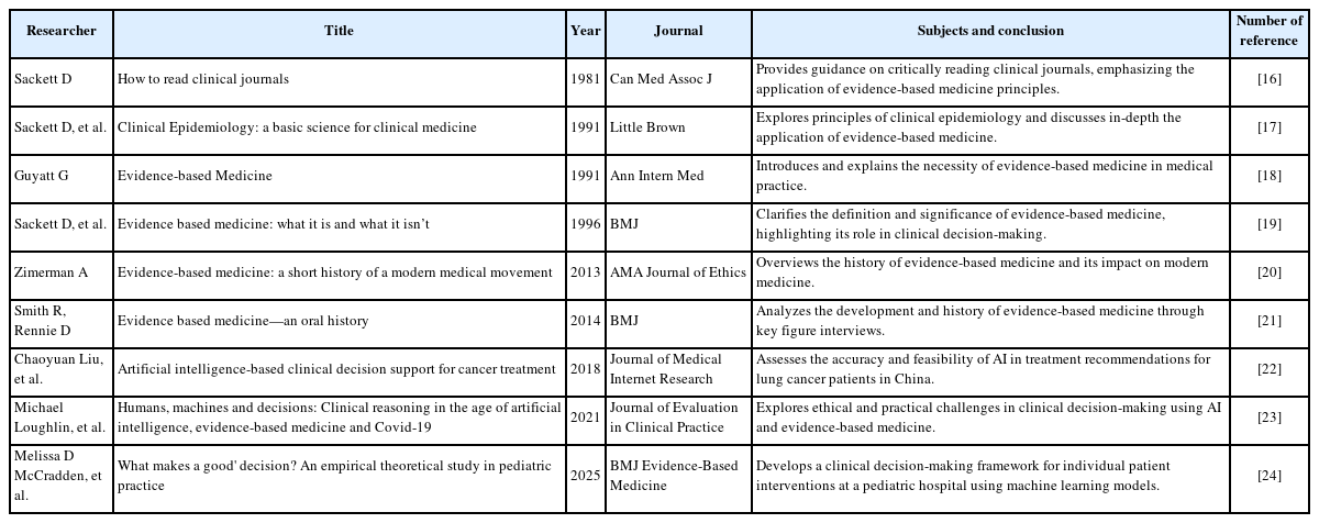 In his historical overview, Zimerman (2013) characterized EBM as a transformative movement that restructured modern medicine [20]. He analyzed the shift from an authority-centered model of care to an evidence-centered decision-making structure. Similarly, Smith & Rennie (2014) reconstructed the conceptual formation, dissemination, and internal debates of EBM through interviews with key contributors [21]. Their work highlights that EBM did not emerge as a singular academic theory but rather evolved as a body of practical knowledge at the intersection of clinical realities and health policy.